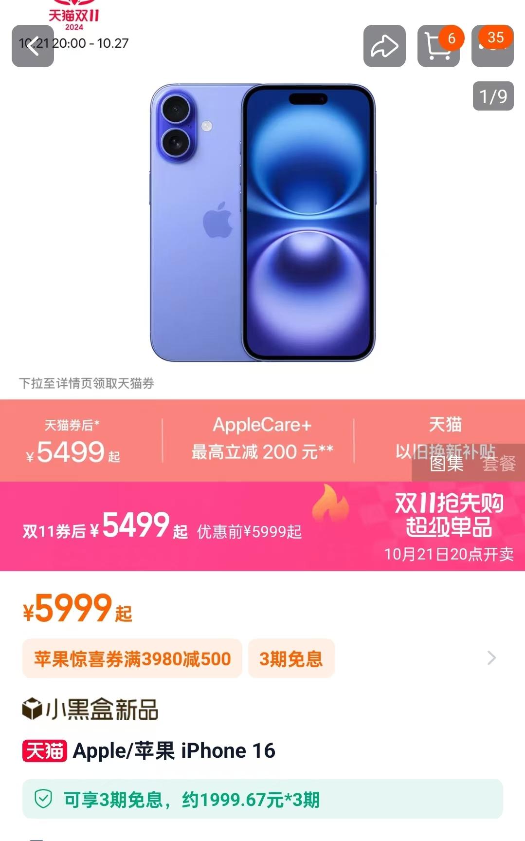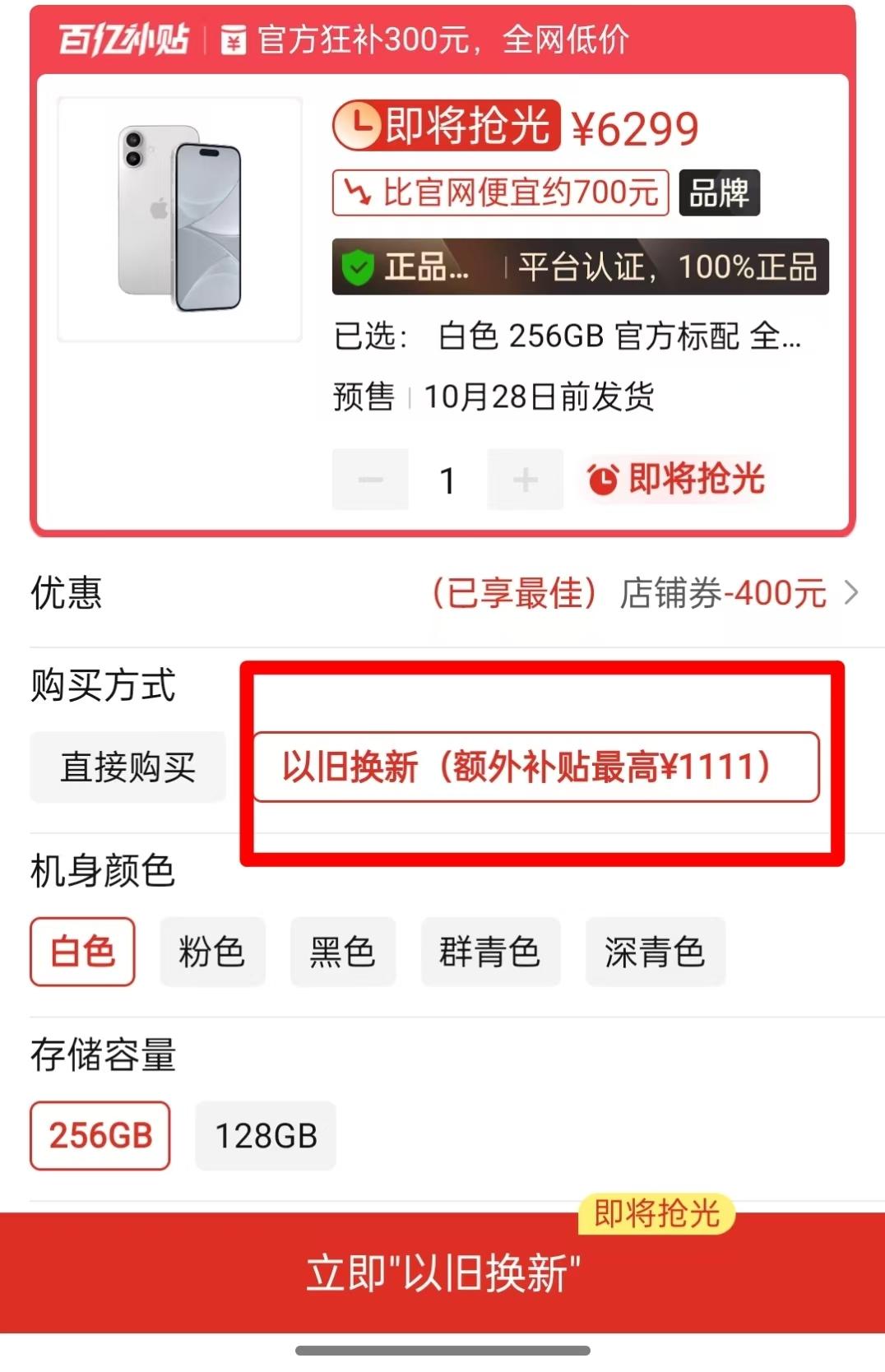 记者在天猫Apple Store官方旗舰店看到,iPhone 16、iPhone 16 Plus、iPhone 16 Pro和iPhone 16 Pro Max原价分别为5999元起、6999元起、7999元起、9999元起,双11券后价则分别为5499元起、6499元起、7499元起和9499元起,即该系列每款手机均优惠500元。此外,苹果手机以旧换新至高补贴1100元,叠加后购买iPhone 16系列手机至高优惠1600元。