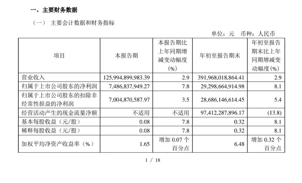10月22日,中国电信发布三季度报告。数据显示,2024年前三季度,中国电信营业收入为人民币3,919.68亿元,较去年同期增长2.9%,其中服务收入为人民币3,628.86亿元,较去年同期增长3.8%。归属于上市公司股东的净利润为人民币292.99亿元,较去年同期增长8.1%。归属于上市公司股东的扣除非经常性损益的净利润为人民币286.86亿元,较去年同期增长5.4%。基本每股收益为人民币0.32元,较上年同期增长8.1%。加权平均净资产收益率为6.48%,较去年同期增长0.32个百分点。