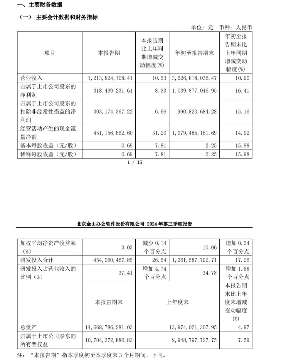 10月25日晚间,金山办公正式公布了2024年第三季度财报数据。第三季度,金山办公实现营业收入12.14亿元,同比增长11%;归属于母公司所有者净利润3.18亿元,同比增长8%;归属于母公司所有者扣除非经常性损益净利润3.03亿元,同比增长7%,继续保持稳健增长。