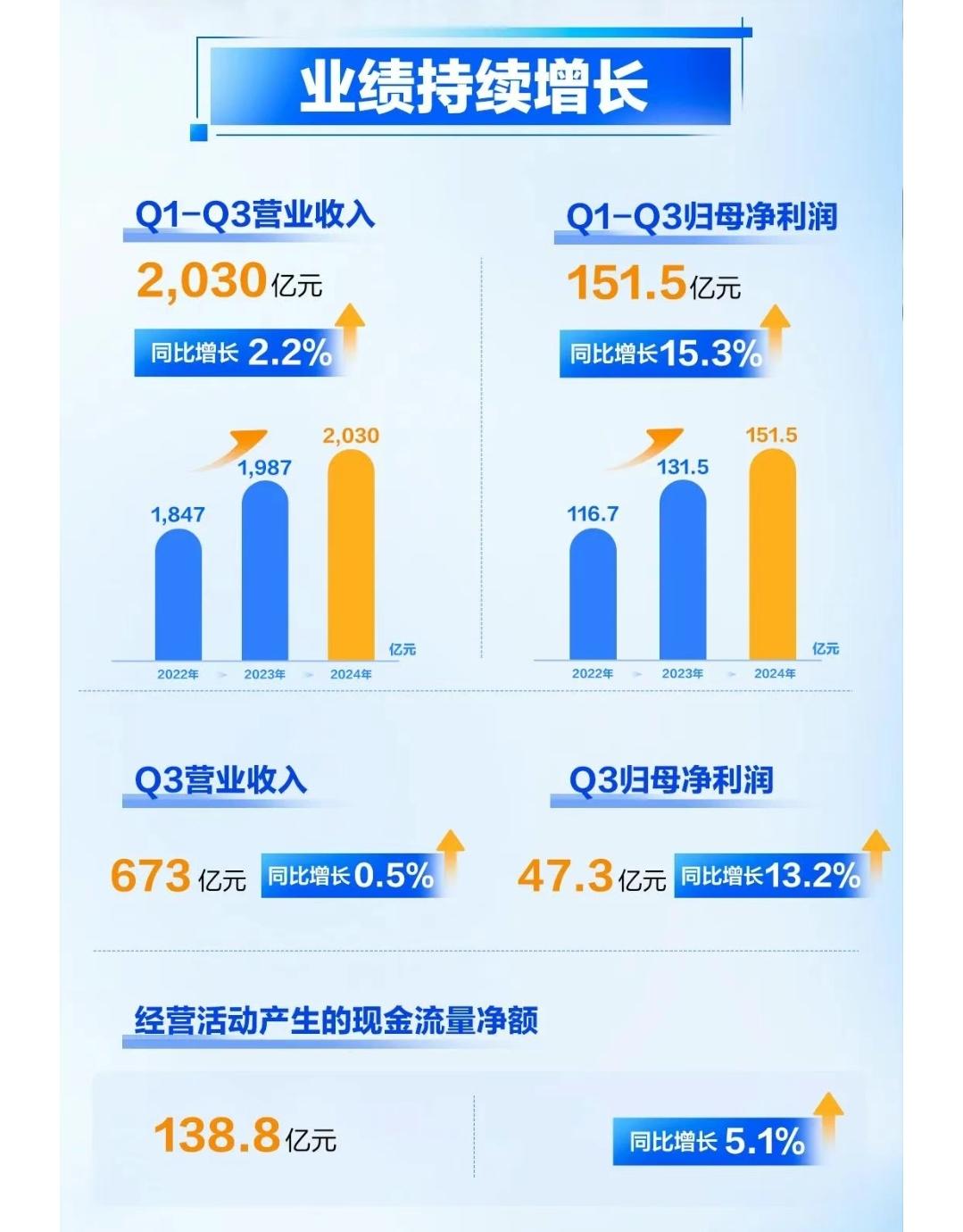 10月29日晚间,海尔智家发布2024三季报:继续保持高基数下稳健增长。2024前三季度,海尔智家实现营业收入2030亿元,同比增长2.2%;归属于上市公司股东的净利润151.5亿元,同比增长15.3%。