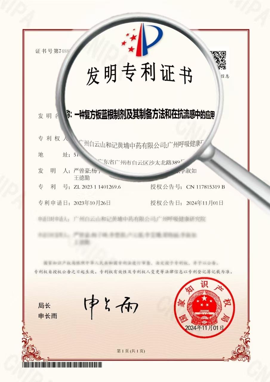 近日,广州白云山和记黄埔中药有限公司与广州呼吸健康研究院共同申请的《一种复方板蓝根制剂及其制备方法和在抗流感中的应用》专利,正式获得国家知识产权局的发明专利授权。这一重要成果标志着白云山复方板蓝根颗粒在抗流感领域取得了关键性突破,为产品的持续发展提供了坚实的科研成果支撑。