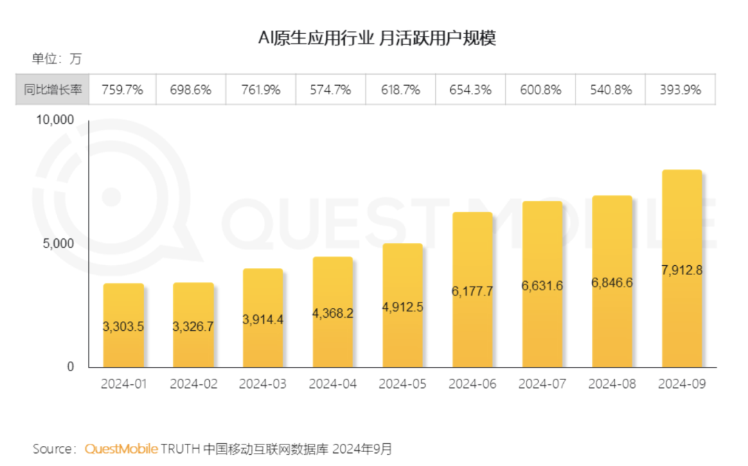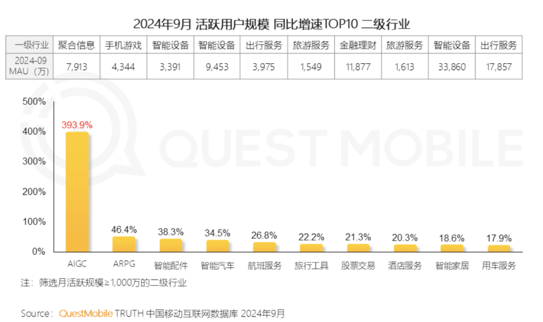 生成式人工智能加速落地应用,成为数字创新和升级转型的“新工具”。AI发展路径的“B、C双打”之势已经形成。数据显示,C端方面,截至9月份,AIGC App月活规模已经达到7912.8万,同比增长393.9%。“综合工具类”已经向通用型应用发展的态势。截至9月份,豆包、文小言、Kimi智能助手月活用户分别达到4197.6万、1191.5万、1024.8万,活跃用户3日留存率分别为39.1%、31.2%、32.2%。