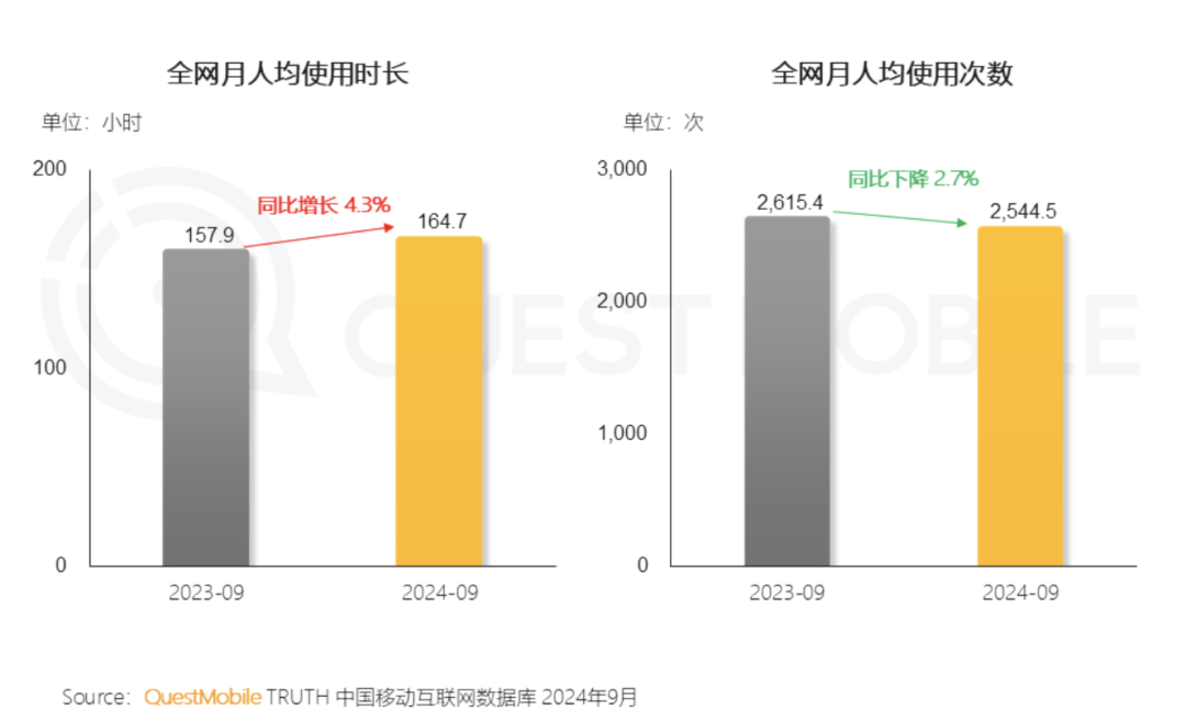 全网月人均使用时长上升,使用次数下降,或许因为内容丰富度提高,使得用户愿意花更多时间深入体验,而非频繁地浅尝辄止。QuestMobile数据显示,2024年9月,全网月人均使用时长164.7小时,较去年同期增长4.3%;月人均使用次数2544.5次,同比下降2.7%。