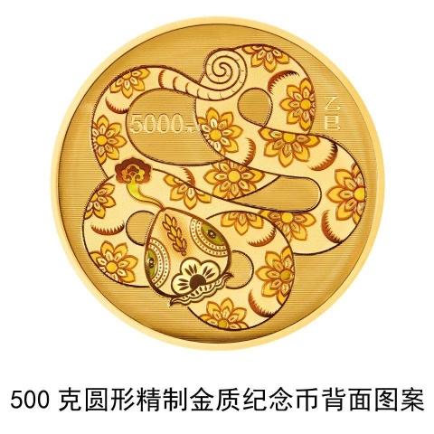 500克圆形金质纪念币背面图案为装饰蛇造型。
