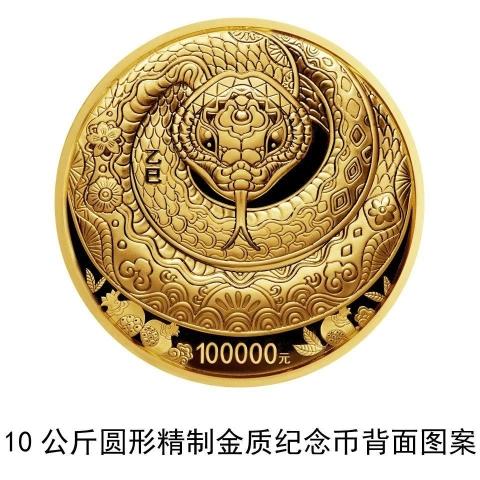 10公斤圆形金质纪念币背面图案为蛇造型,衬以石榴纹饰组合设计。