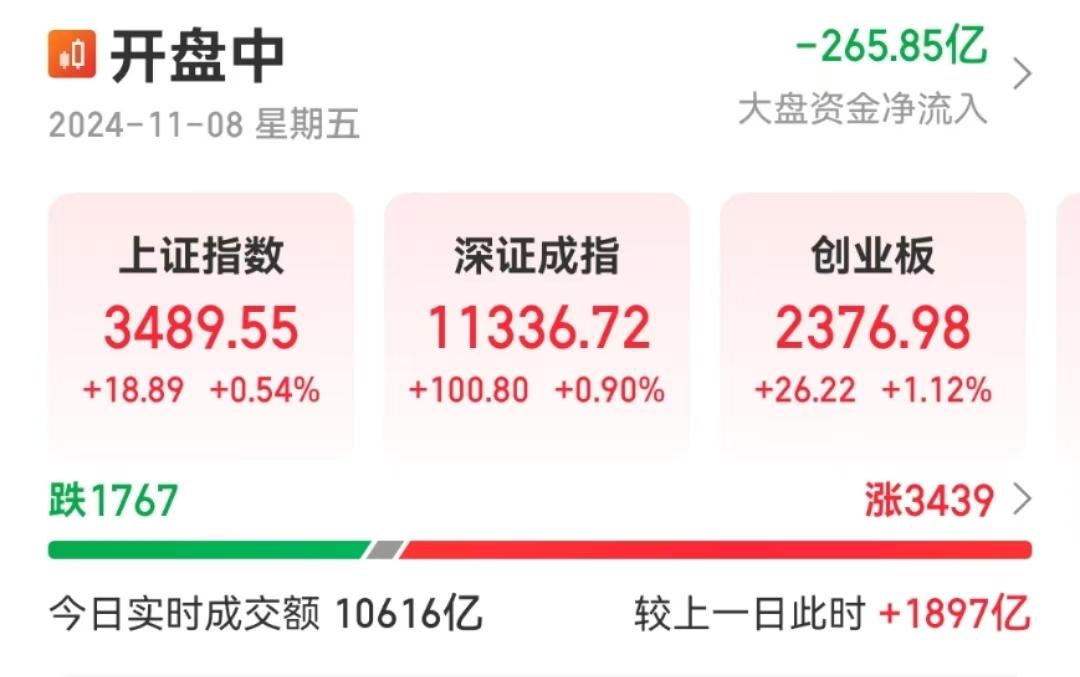 11月8日,上证指数高开0.91%,一度站上3500点;创业板指涨1.96%。截至10时,市场总成交额破万亿元,较上一交易日增长超1800亿元。