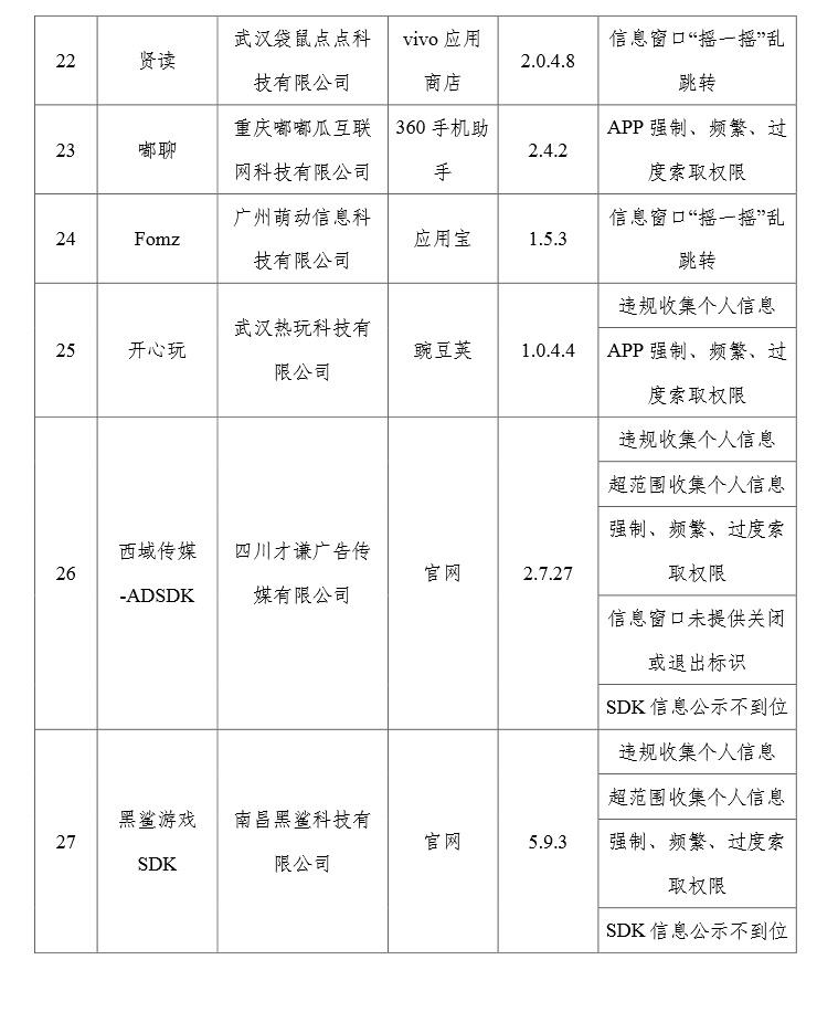 工业和信息化部高度重视用户权益保护工作,依据《个人信息保护法》《网络安全法》《电信条例》《电信和互联网用户个人信息保护规定》等法律法规,持续整治APP侵害用户权益的违规行为。近期,工信部组织第三方检测机构进行抽查,共发现27款APP及SDK存在侵害用户权益行为(详见附件),现予以通报。