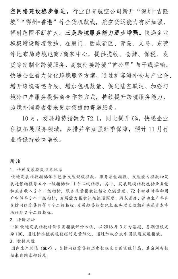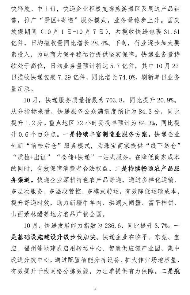 中新网11月13日电 国家邮政局13日发布10月中国快递发展指数报告,经测算,2024年10月中国快递发展指数为464.4,同比提升21.1%。其中发展规模指数、服务质量指数、发展能力指数和发展趋势指数分别为583.7、703.8、236.6和72.1,同比分别提升31.1%、20.9%、3.7%和6%。10月,行业进入业务旺季,业务增速明显加快,寄递网络高效运行,产业协同持续深化,跨境服务能力有所提升。