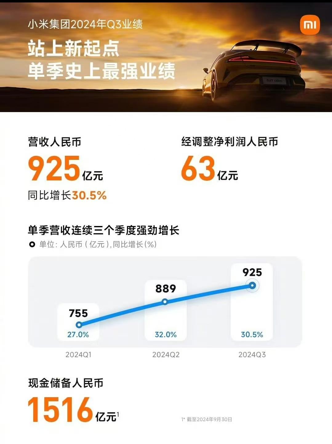 11月18日晚间,小米集团发布了2024年第三季度财报:总收入达到925亿元,同比增长30.5%;净利润为53亿元,而上年同期49亿元。经调整净利润为63亿元,同比增长4.4%。在此之中,作为小米集团“第三条增长曲线”的汽车业务表现继续受到高度关注。
