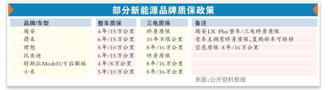 记者注意到,今年以来,多家新能源汽车制造商开始普及“三电系统终身质保”服务,并将质保政策门槛有所降低。如广汽埃安为旗下多款电车提供无限期的电池保障,包括电机和电控系统等的终身保修;上汽荣威推出了不限制首任车主、年限和行驶里程的三电终身质保服务。不过,也未必个个“免费”,如特斯拉、比亚迪的车主可以通过购买来达到延长质保的目的。比亚迪新能源汽车提供的原始保修期是6年或行驶15万公里,但车主可以选择支付4300元,将保修期扩展至8年或20万公里,相当于增加了2年的时间和5万公里的行驶距离。