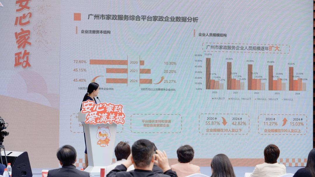 启动仪式现场发布了广州市家政行业发展报告,依托“广州市家政服务综合平台”大数据,广州家政行业在过去五年中展现出提质扩容发展新趋势。一是行业整体实力增强,注册资本超500万元的企业数量占比从10.3%上升至25.27%。二是从业人员结构持续优化,男性从业人员占比从6.2%提升至11%。三是从业人员年轻化、高学历化趋势明显,“安心服务证”持证人员中本科(含大专)及以上学历占比由11.5%上升至18.1%,平均年龄由46岁下降至41岁。启动仪式还发布了2024年度广州市家政服务信用等级综合评价5A家政企业名单,以及2024年度羊城家政技能之星获奖选手,对诚信经营、用心服务的家政企业和职业技能竞赛中表现优异的从业人员予以肯定与鼓励。