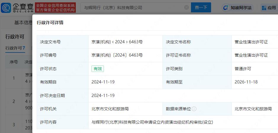 11月26日,企查查APP显示,近日,与辉同行(北京)科技有限公司新增营业性演出许可证,许可内容为申请设立内资演出经纪机构审批,有效期自2024年11月19日至2026年11月18日,许可机关为北京市文化和旅游局。此前,该公司已获得广播电视节目制作经营许可证。