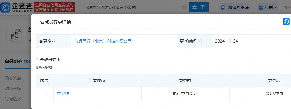 企查查显示,与辉同行(北京)科技有限公司成立于2023年12月,注册资本1000万元人民币,董宇辉为法定代表人并全资持股。变更信息显示,近日,董宇辉在该公司由执行董事变更为董事。