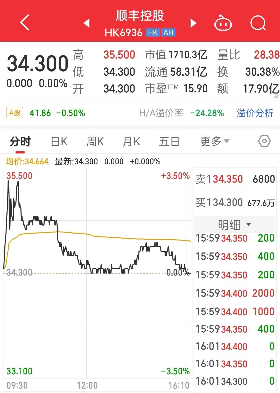 上市首日,顺丰控股H股以34.3港元/股开盘,最高涨至35.5港元/股,最终收盘于34.3港元/股,收盘价与招股价持平。若未行使超配权,顺丰募集资金净额达到56.62亿港元,成年内香港的第二大规模IPO。