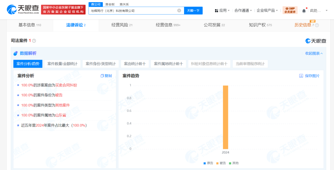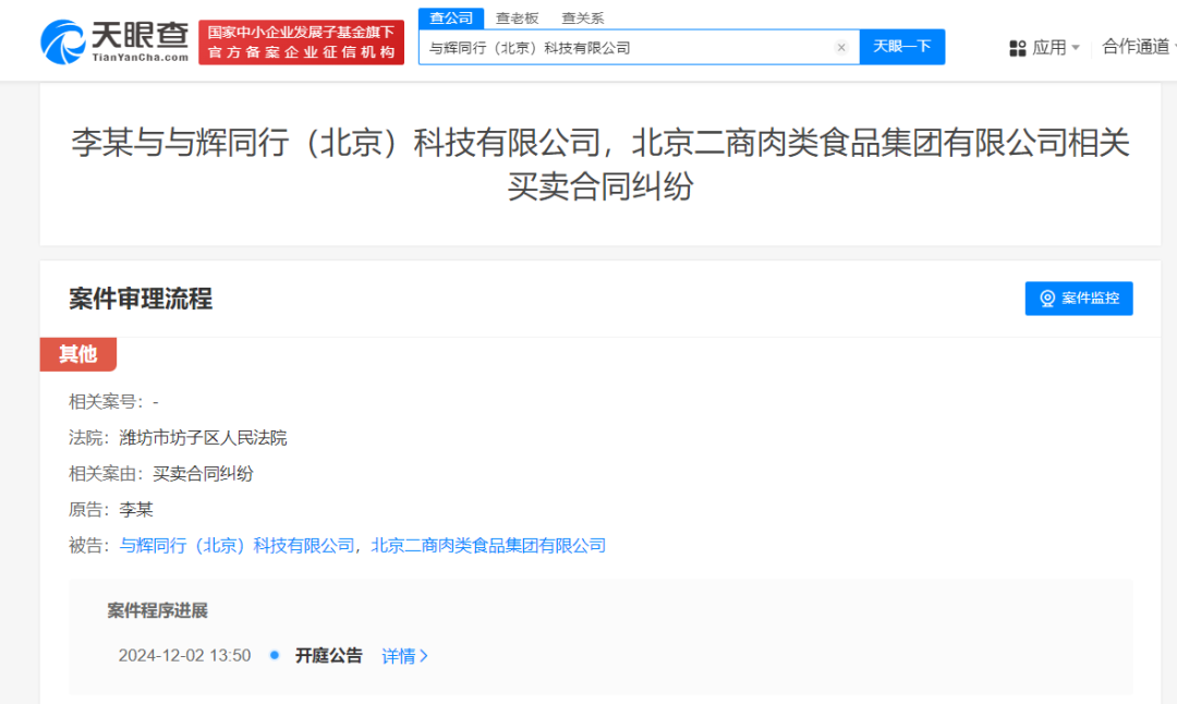 11月28日,天眼查司法案件信息显示,近日,李某和与辉同行(北京)科技有限公司、北京二商肉类食品集团有限公司相关信息网络买卖合同纠纷案件新增开庭公告,原告为李某,该案将于12月2日在潍坊市坊子区人民法院开庭审理。
