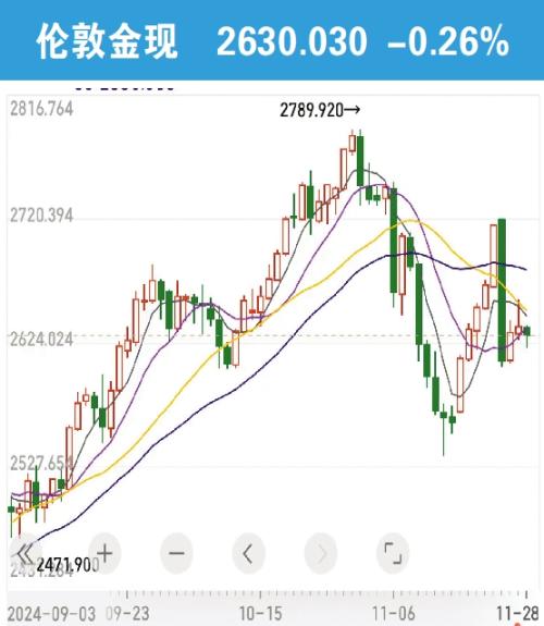 大洋网讯 本周以来,黄金价格再度出现震荡走势。11月25日伦敦金现下挫超100美元/盎司,跌幅达3.88%,随后几天黄金小幅回升上涨,截至11月28日,金价报2630.03美元/盎司。