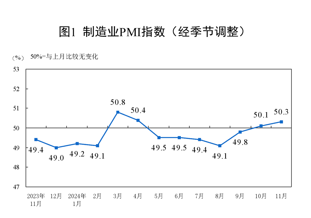 11月份,随着一系列存量政策和增量政策持续协同发力,制造业PMI在景气区间上行,升至50.3%,扩张步伐有所加快。