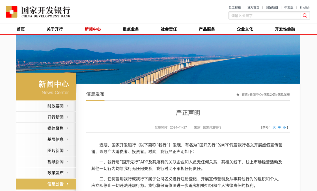 对此,国开行严正声明,国开行与“国开先行”App及其所有的关联企业和人员无任何关系,其相关线下、线上市场经营活动及其他一切行为均与国开行无任何关系,国开行对此不承担任何责任。