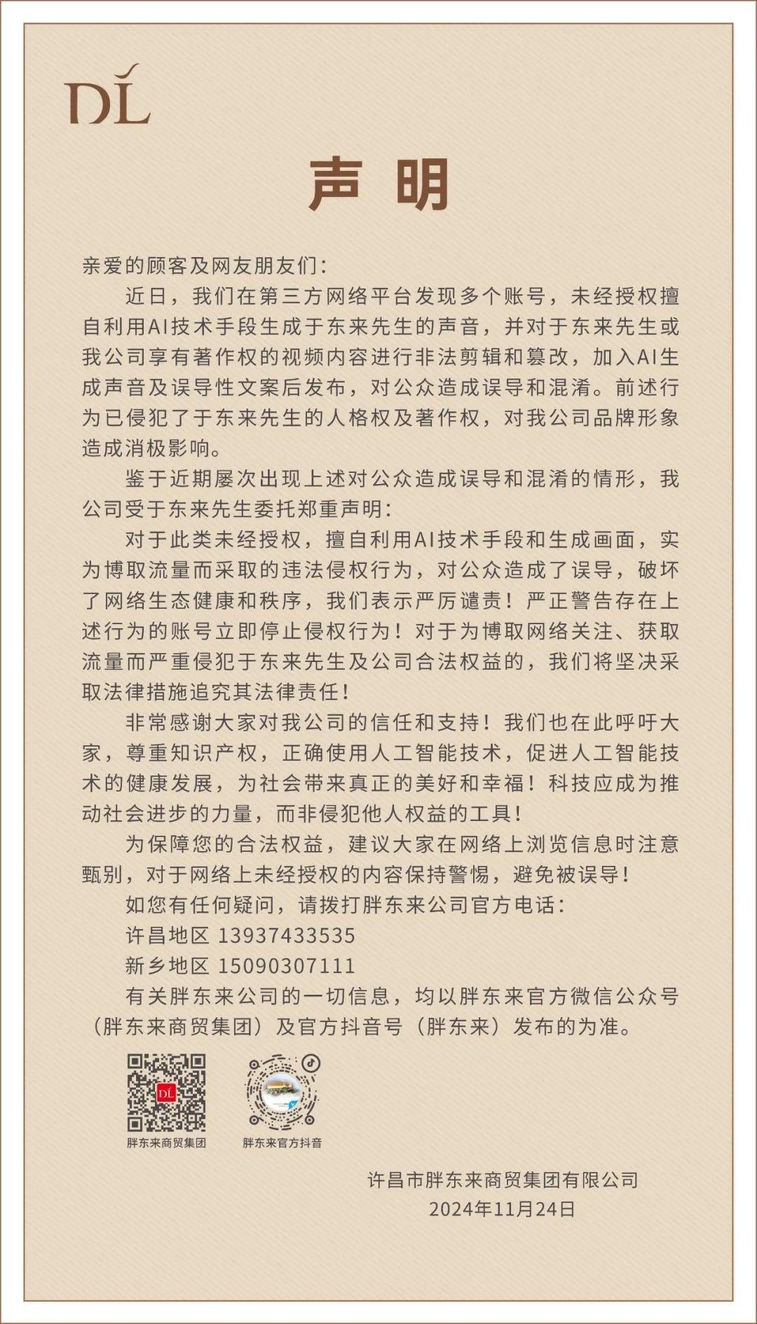 此前,胖东来在11月24日曾发布声明称,近日,该集团在第三方网络平台发现多个账号,未经授权擅自利用AI技术手段生成于东来的声音,并对于东来或胖东来商贸集团享有著作权的视频内容进行非法剪辑和篡改,加入AI生成声音及误导性文案后发布,对公众造成误导和混淆。