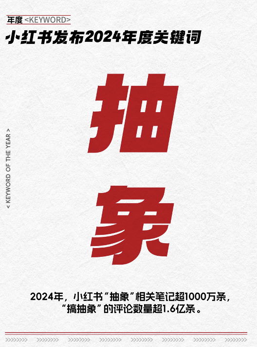 12月2日,小红书综合社区内用户笔记、阅读量和评论互动等指标,发布2024年度关键词——“抽象”。“玩抽象”正演变成一种生活态度和处事方式,小红书相关负责人表示,越来越多人在面对意外和困难时选择以轻松、反转的方式“一笑而过”。截至发稿时,2024年在小红书和“抽象”相关的笔记已超过1000万条。