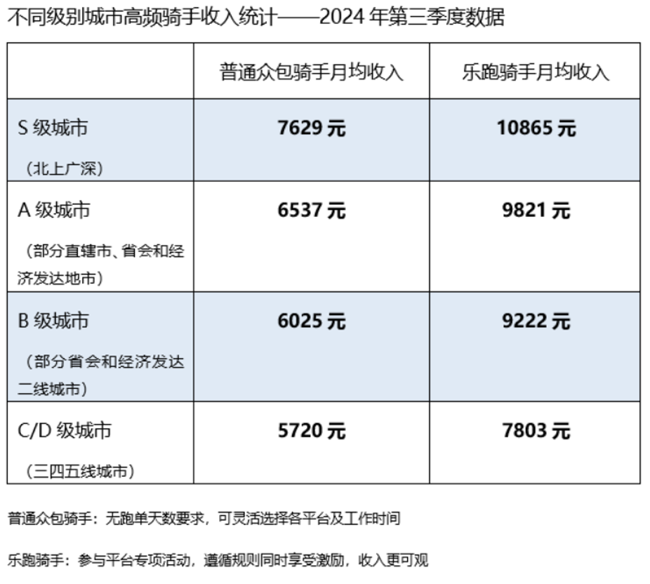 据了解,高频骑手指当月接单在22天及以上、日均接单时长在6小时及以上的骑手,可以理解为是以此作为相对稳定的收入来源。在北上广深等高线城市,高频骑手的月均收入为7629元至10865元。收入区间差异主要源自跑单类型的差异,例如普通众包骑手没有跑单天数要求,工作时间更自由,能自主、灵活选择各企业及平台的相关工作;而乐跑等参与平台专项活动的骑手,有各类激励和相应规则,获取的收入也更为可观。