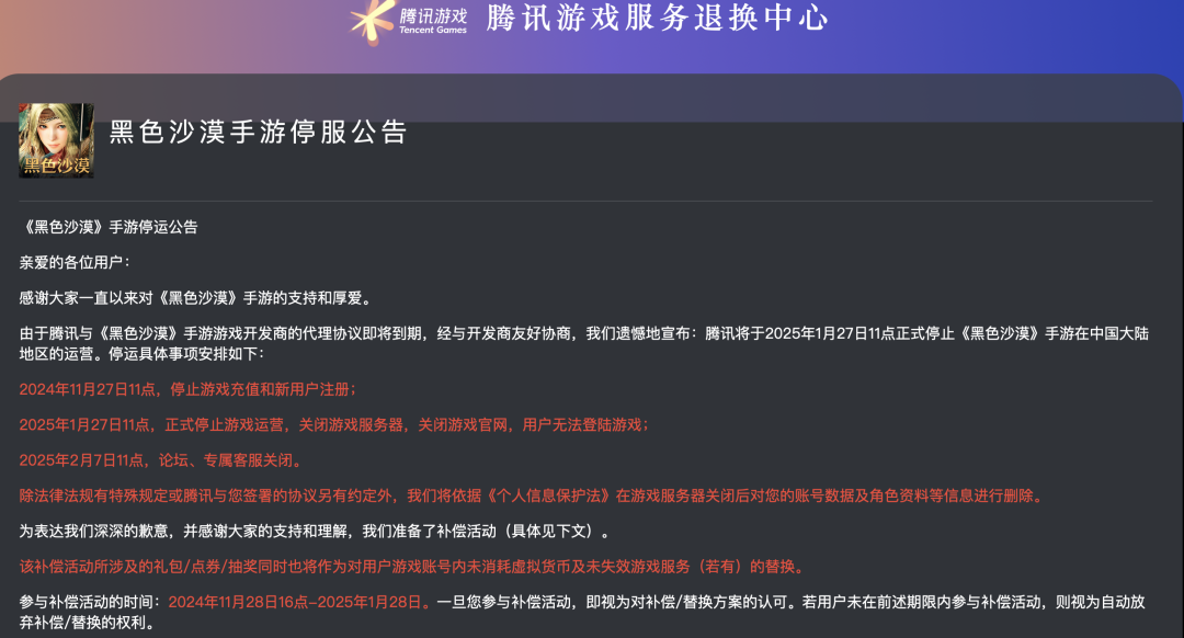 无独有偶,11月28日,腾讯《黑色沙漠》手游发布了一则停运公告,宣布决定于2025年1月27日11点正式停止《黑色沙漠》手游在中国内地市场的运营。对于为何停运,腾讯方面称,由于与《黑色沙漠》手游游戏开发商的代理协议即将到期。