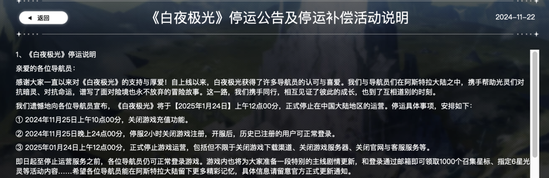 11月22日,腾讯二次元手游《白夜极光》国服发布停运公告称,游戏将于2025年1月24日上午12点正式停止在中国内地市场的运营。根据停运公告显示:2024年11月25日上午10点,关闭游戏充值功能。2024年11月25日24点,停服2小时关闭游戏注册,开服后,历史已注册的用户可正常登录。2025年1月24日上午12点,正式停止游戏运营,包括但不限于关闭游戏下载渠道、关闭游戏服务器、关闭官网与客服服务等。