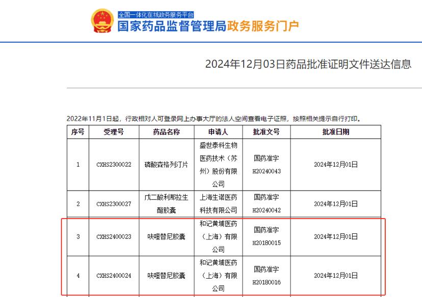 2024年12月3日,和黄医药宣布,自主研发创新药物呋喹替尼获得中国国家药品监督管理局(NMPA)批准,联合信迪利单抗用于既往系统性抗肿瘤治疗后失败且不适合进行根治性手术治疗或根治性放疗的晚期错配修复完整(pMMR)子宫内膜癌(EMC)患者。
