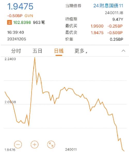 大洋网讯 债券市场表现强劲。12月5日,10年期国债收益率继续震荡走低,10年期国债活跃券(24附息国债11,下同)盘中一度下跌至1.945%,由于债券收益率和价格成反比,这也意味着债券价格走高、债市走强。有业内分析指出,在资金面宽松、降准预期等影响下,债市或将震荡走强,但潜在回调风险也不容忽视。