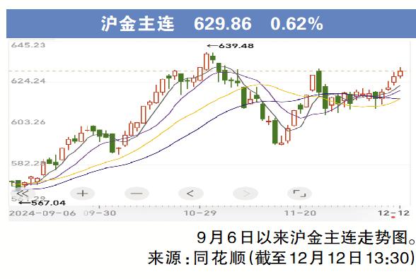 12月12日,黄金期货连续4日走强再度上涨,截至上午10点,沪金主连涨0.62%至629.90元/克,刷新近两周来的新高。国内黄金消费市场方面,周大福、老凤祥、六福珠宝、周六福等黄金品牌金价达815元/克,周生生金价达823元/克。