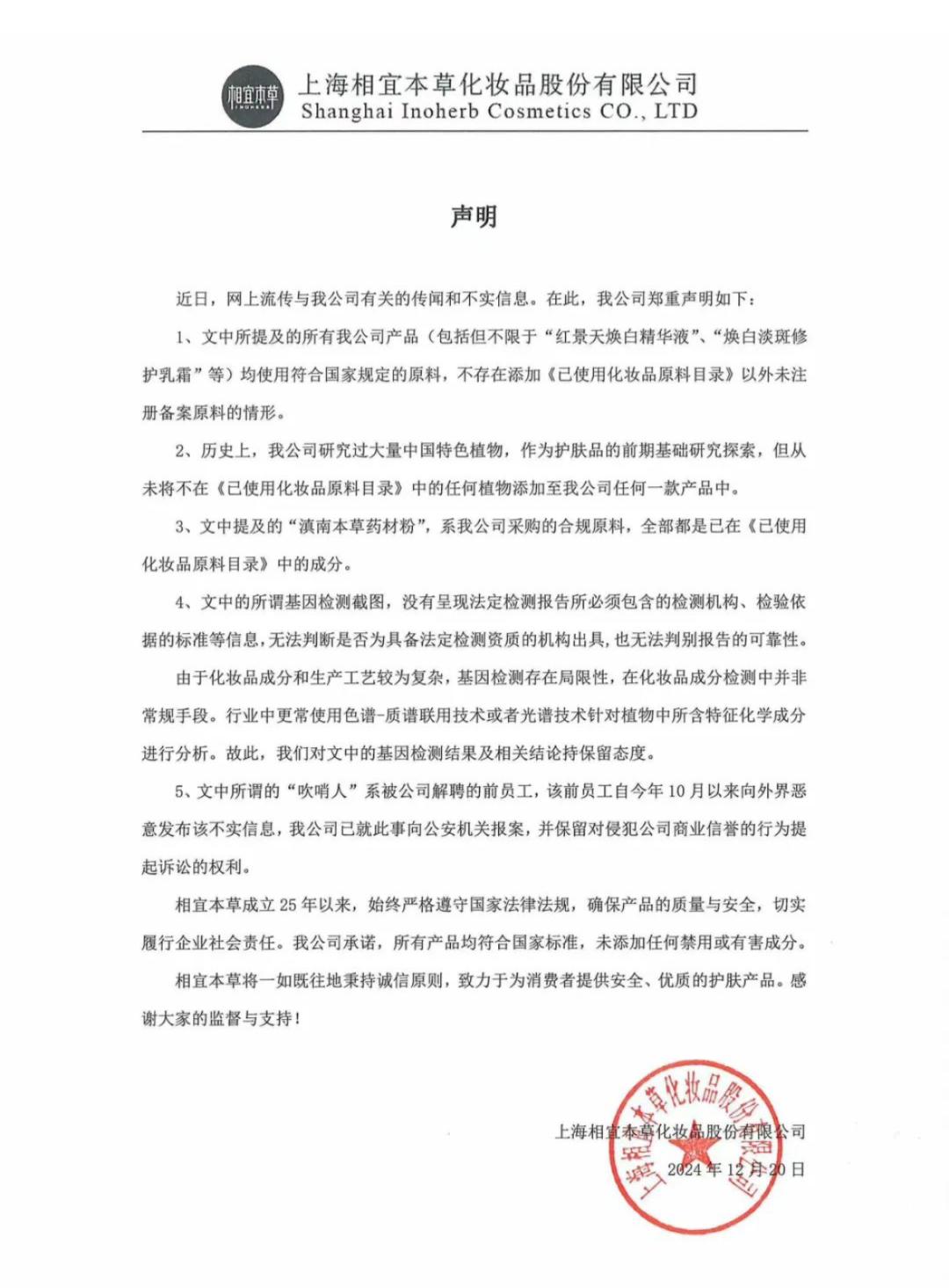 12月20日,相宜本草针对近日舆论关注的“相宜本草原料问题”情况声明。
