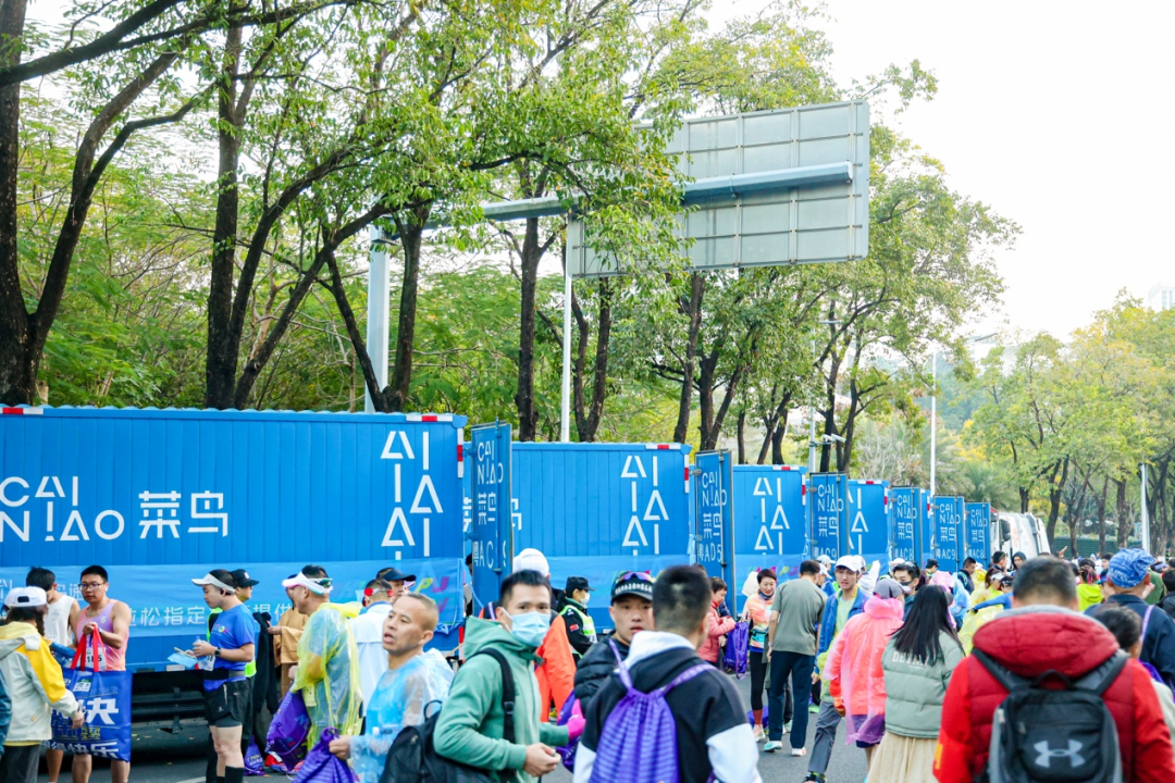 为了方便选手轻装上阵,马拉松赛事均会在起点设置存包点,再转运至终点。为了支持此次赛事,菜鸟速递通过数字物流能力,在保障广州地区快递包裹运输的同时,调集22台自营货车参与赛事保障。