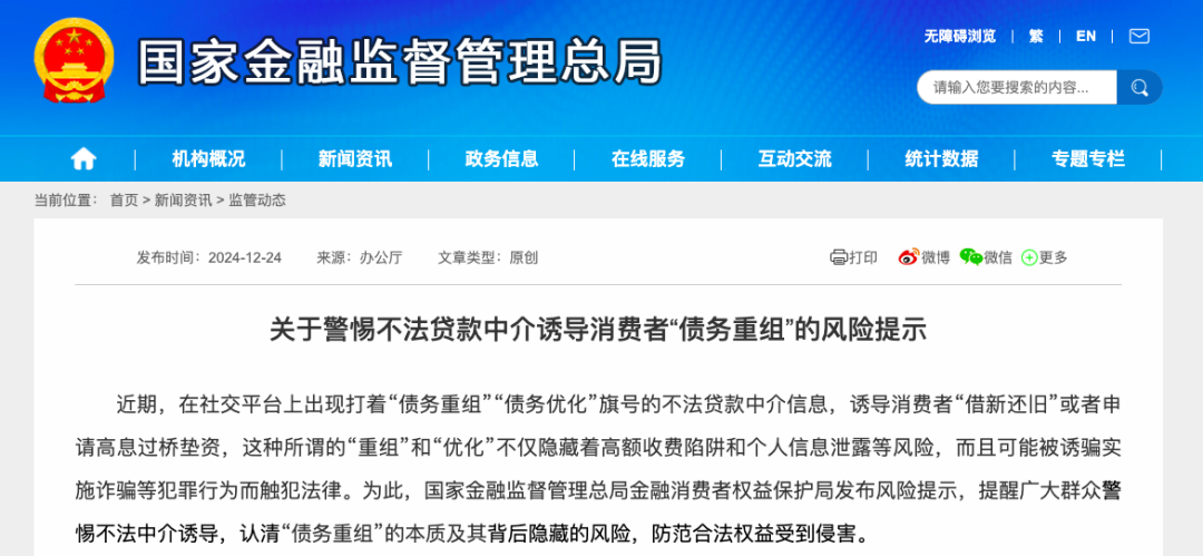 12月24日,国家金融监督管理总局发布关于警惕不法贷款中介诱导消费者“债务重组”的风险提示。