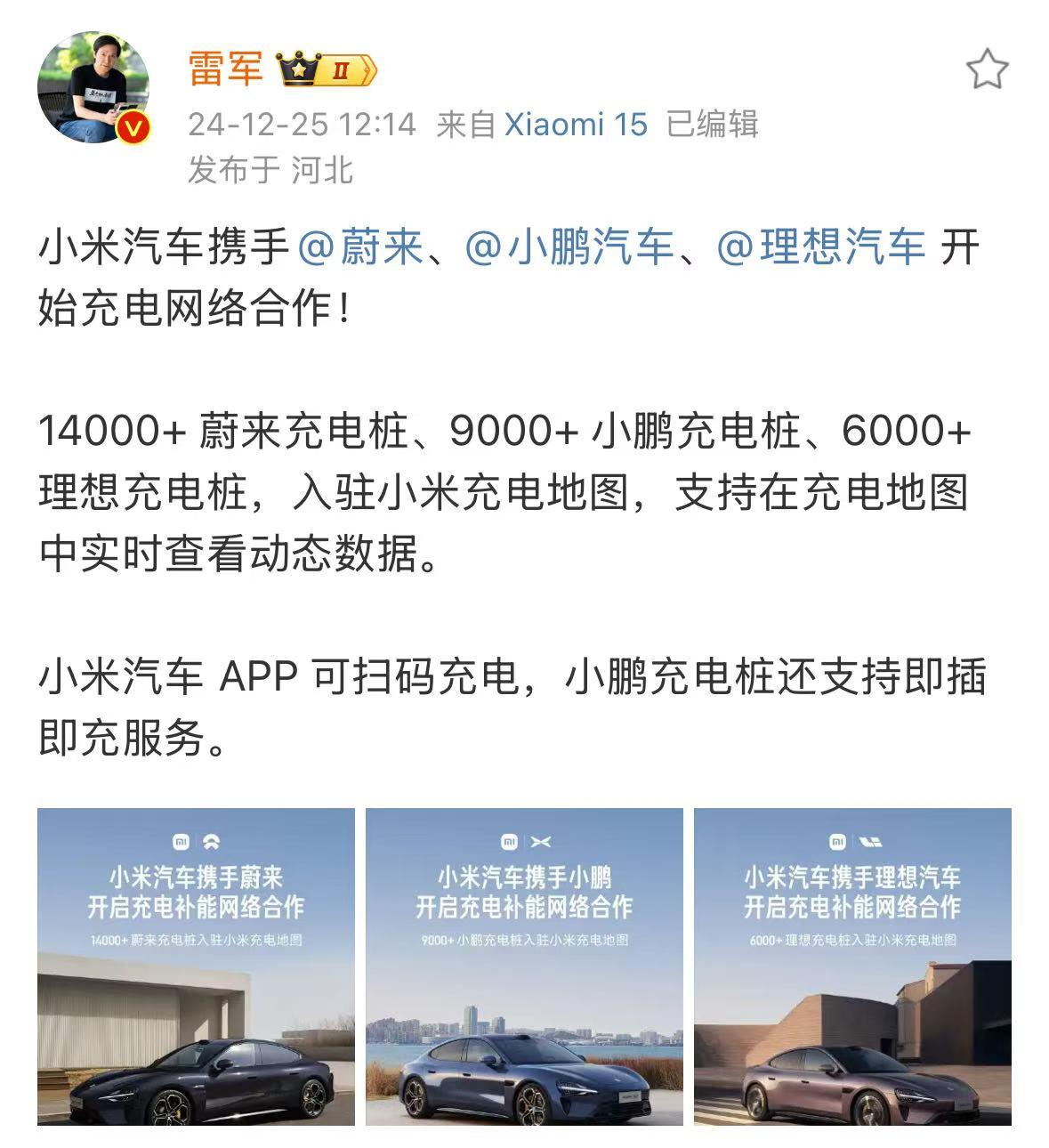 12月25日,小米汽车官宣与“蔚小理”(蔚来汽车、小鹏汽车、理想汽车)开展充电网络合作,三家共有上万根充电桩将全部入驻小米充电地图。“新能源汽车产业发展已经过了‘单打独斗’的时期,产业融合、资源共享是重要发展趋势。”业内人士指出,此次合作的核心在于充电桩资源的共享与整合。