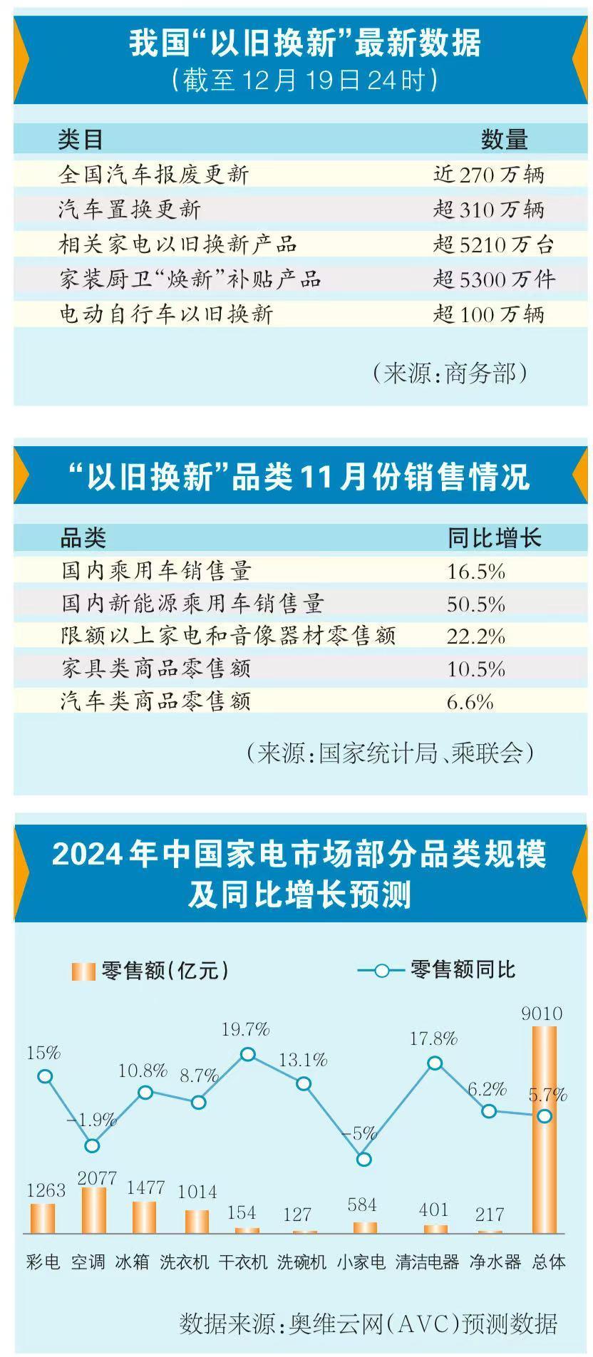 从数据上看,效果相当显著。12月20日,商务部专题新闻发布会上,商务部消费促进司司长李刚表示,这项工作开展以来,各方参与度很高,全国范围以旧换新热度不减,政策成效显著。据介绍,截至12月19日24时,全国汽车报废更新近270万辆,汽车置换更新超310万辆,超3330万名消费者购买相关家电以旧换新产品超5210万台,家装厨卫“焕新”补贴产品超5300万件,电动自行车以旧换新超100万辆。