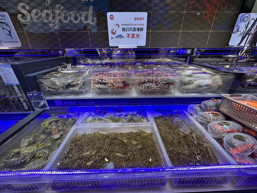 据介绍,在服务方面,门店学习了胖东来的细节提升,比如为特殊群体提供放大镜和血压测量仪等设施,为宠物设置了专门的寄存处,而且休息区提供微波炉、直饮水、冰袋、纸巾、吸管等,在生鲜区为厨艺新手提供烹饪小贴士,还新增了海鲜加工厨房,满足顾客现场加工烹饪的需求。
