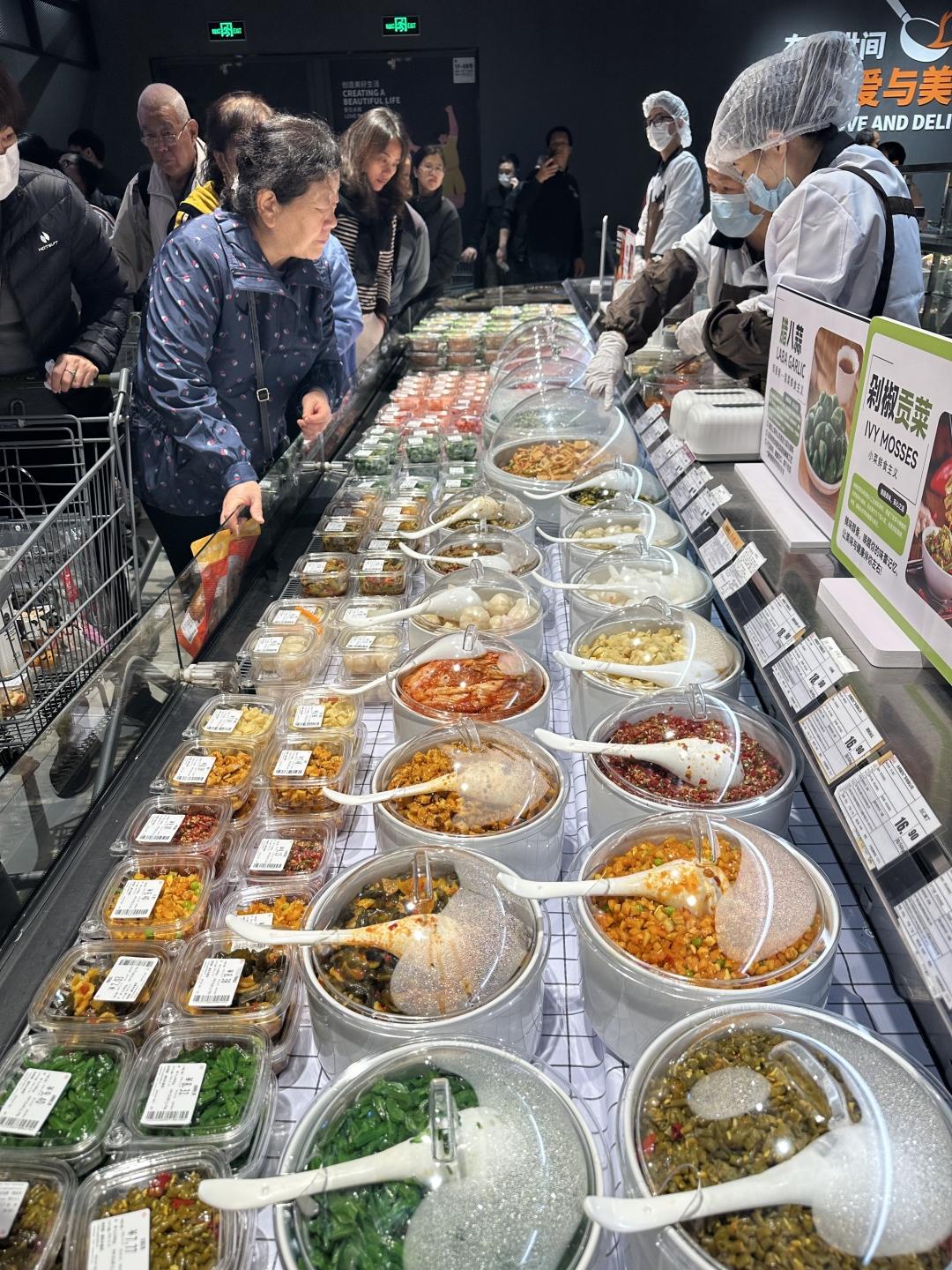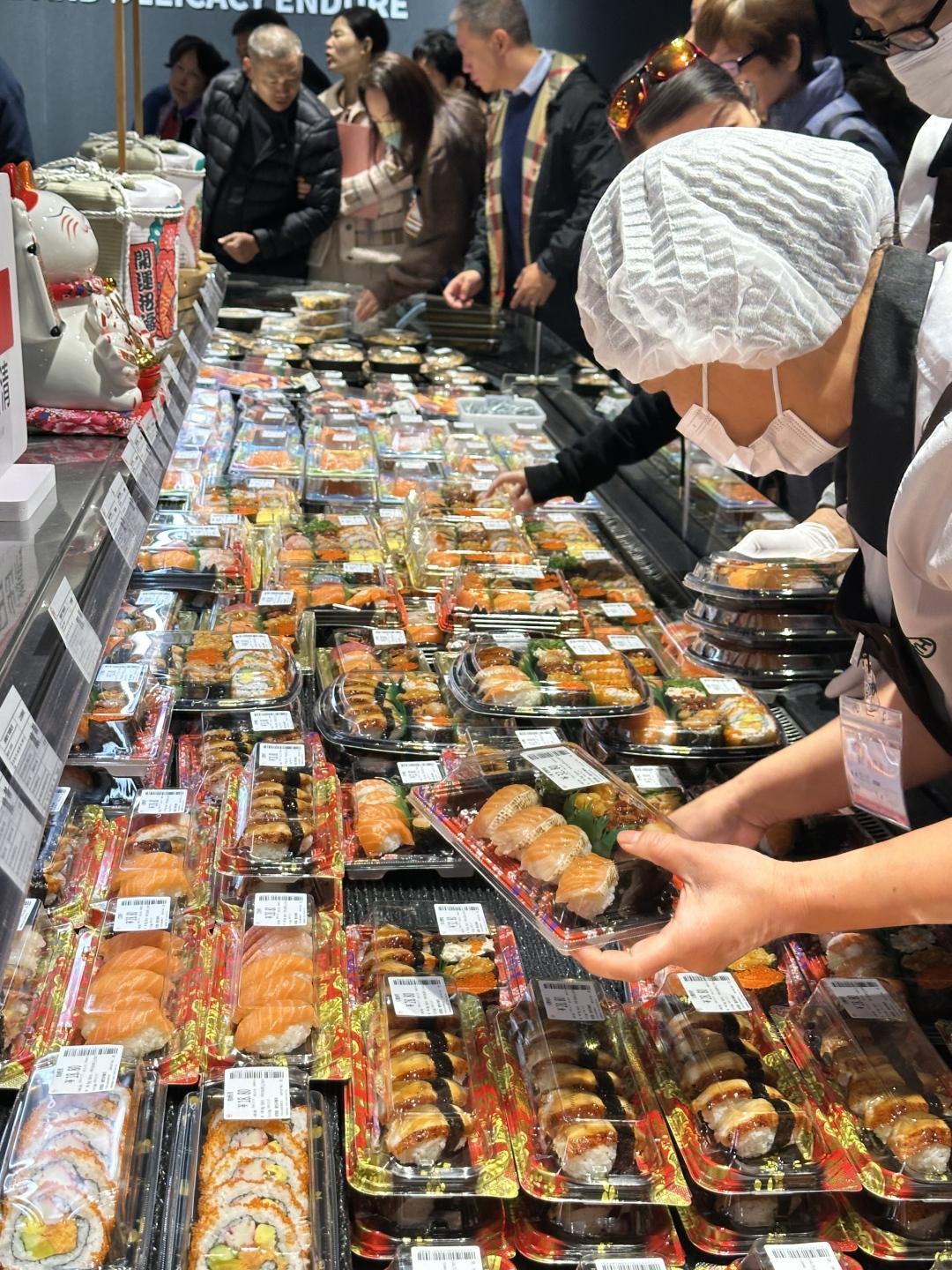 记者注意到,现制餐饮是调改后客流最密切的区域之一,香味扑鼻的美食吸引了众多消费者围观采购,据介绍,调改后门店的熟食商品汰换升级比例超过90%,引入了豆瓣甜肠、卤水猪蹄、捞汁小海鲜等新品。