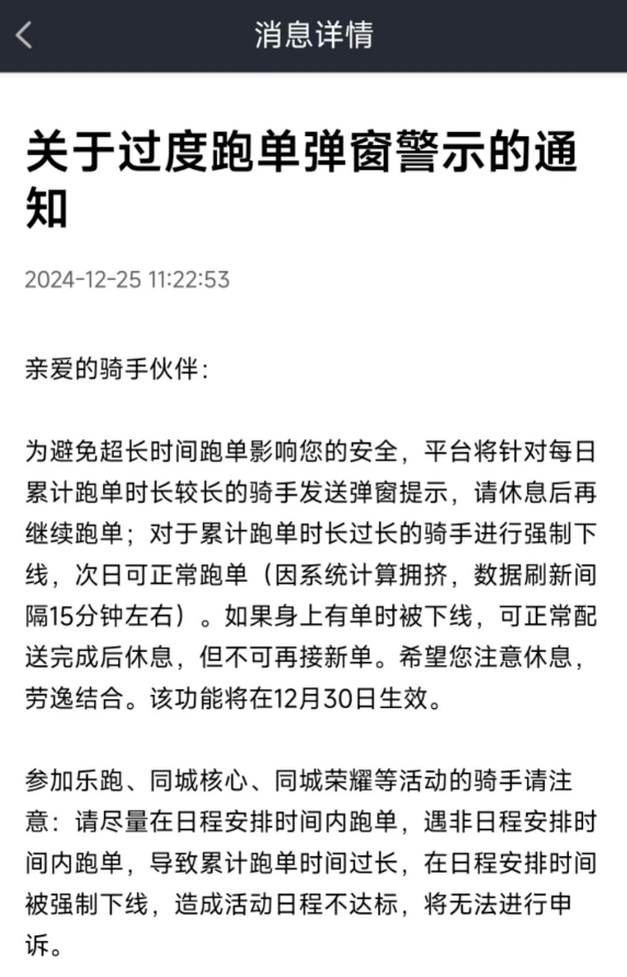 美团北京骑手APP内通知显示,12月30日防疲劳功能生效。