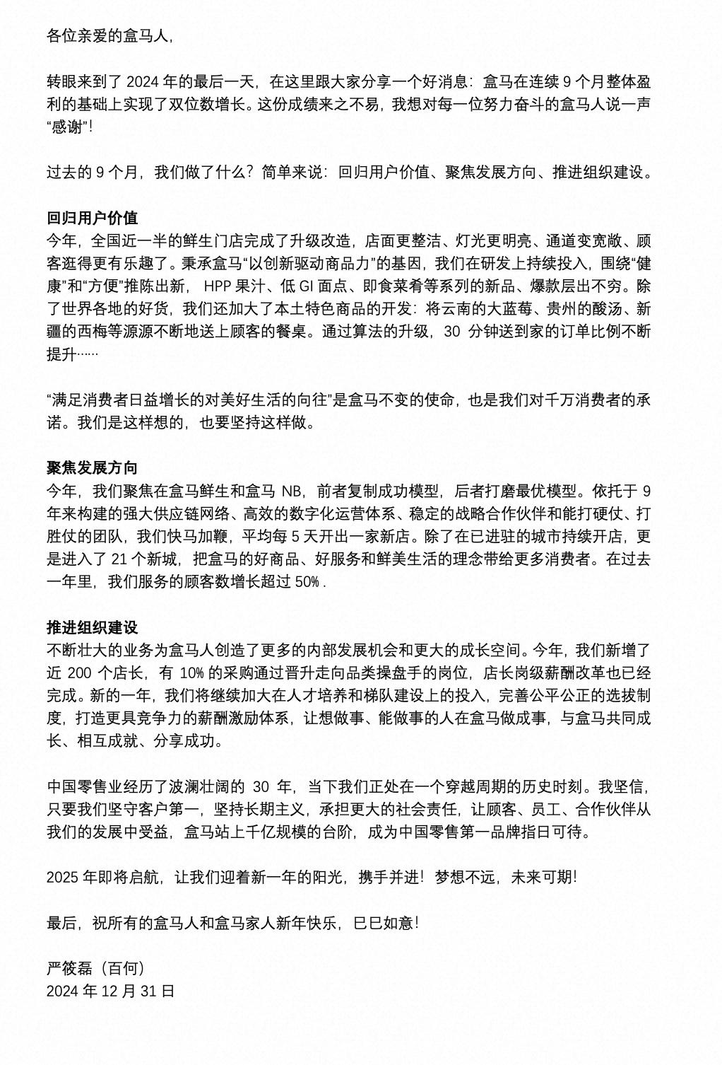 2024年12月31日,盒马新任CEO严筱磊发布全员内部信,称过去一年,盒马在连续9个月整体盈利的基础上实现了双位数增长,顾客数增长超过50%。据悉,这也是盒马成立以来的历史最佳。