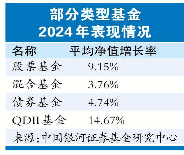 伴随着去年9月下旬以来,股市的回暖以及债市的震荡走高,相关基金净值均迎来上涨。中国银河证券基金研究中心数据显示,2024年股票基金、债券基金、混合基金的平均净值增长率分别为9.15%、4.74%和3.76%;QDII基金、商品基金的平均净值增长率均超10%。