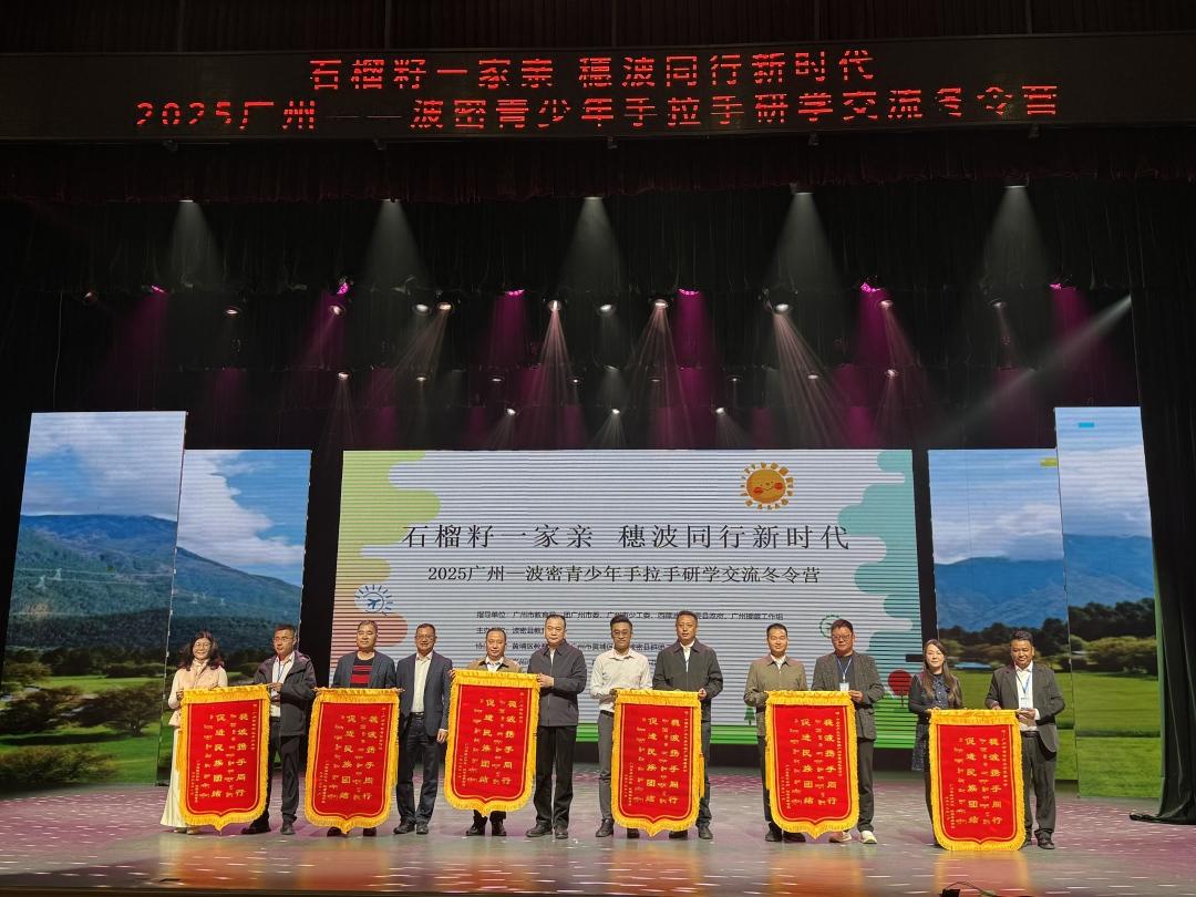 1月5日上午,由广州市教育局、团广州市委、广州市少工委、西藏波密县委县政府、广州援藏工作组指导,由波密县教育局主办,黄埔区教育局、团黄埔区委、波密县群团工作部协办,广州市黄埔区青少年宫、黄埔区东荟花园小学承办的“石榴籽一家亲 穗波同行新时代”2025广州—波密青少年手拉手研学交流冬令营在黄埔区青少年宫正式开营。