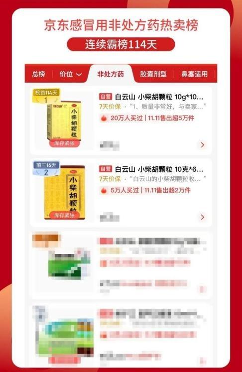 白云山小柴胡双11稳居京东感冒药非处方药Top1