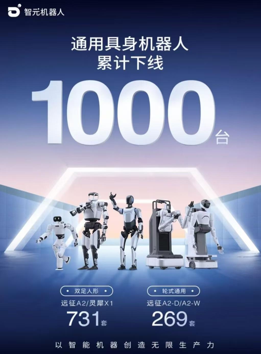 今日,智元机器人对外表示,其通用具身机器人累计下线1000台,其中双足人形机器人远征A2/灵犀X1为731套,轮式通用机器人远征A2-D/A2-W为269套。