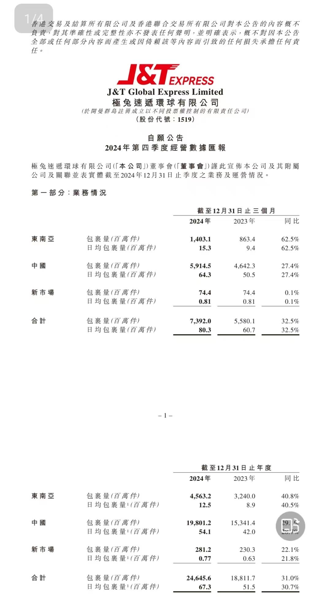 极兔速递首席财务官郑世强表示:“极兔速递在2024年第四季度实现强劲增长,得益于东南亚和中国市场的稳健表现。东南亚第四季度包裹量增长逾6成,除了因为去年同期较低的基数,亦因为主要电商客户在双11购物节等旺季期间的强劲出货量,以及公司在非电商平台持续拓展单量所带动。在中国,我们把握住了快递行业持续高速增长的机遇,进一步巩固了在主要电商平台的市场地位,而我们在逆向物流和个人散件上的战略布局也持续取得亮丽成绩。我们相信凭借强大的网络、优质的服务和多元化的增长策略,公司未来将继续受惠于电商市场的高速增长。”