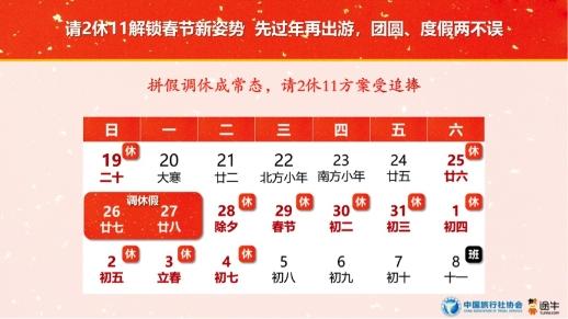 2025年春节为1月28日(除夕)至2月4日(正月初七)放假调休,共8天。《报告》数据显示,“请2休11”的灵活拼假方案受到了不少用户的追捧。“请2休11”即1月26日、27日请假调休,加上1月25日的周日以及春节8天假期,凑出11天的“超长假期”,大家在探亲与度假之间也有了更从容的选择。