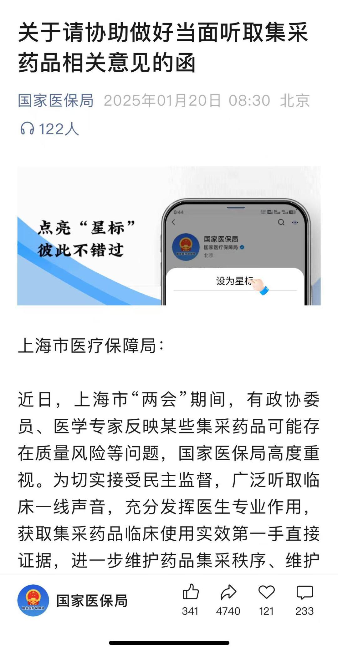 国家医保局1月20日表示,为切实接受民主监督,广泛听取临床一线声音,充分发挥医生专业作用,获取集采药品临床使用实效第一手直接证据,进一步维护药品集采秩序、维护人民群众健康权益,1月21日,国家医保局负责同志带队,联合卫生健康、工业信息化、药品监管部门,赴上海当面听取相关委员、专家关于药品集采政策及中选产品质量保障的意见建议,重点收集有临床数据支撑、有统计学差异的质量和药效问题线索。