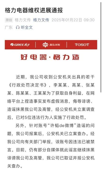 1月22日,“格力文传”发布《格力电器维权进展通报》称,近期,公司收到公安机关出具的若干《行政处罚决定书》,李某某、高某、张某某、陈某某、王某某为了获取自身利益,在网络平台上捏造事实发布虚假消息,侮辱诽谤、造谣抹黑公司及高管,经公安机关立案调查后,已对5位违法行为人实施了行政处罚。