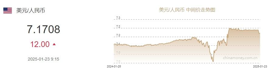 中新网1月23日电 据中国外汇交易中心网站消息,中国人民银行授权中国外汇交易中心公布,2025年1月23日银行间外汇市场人民币汇率中间价为:1美元对人民币7.1708元,下调12个基点。