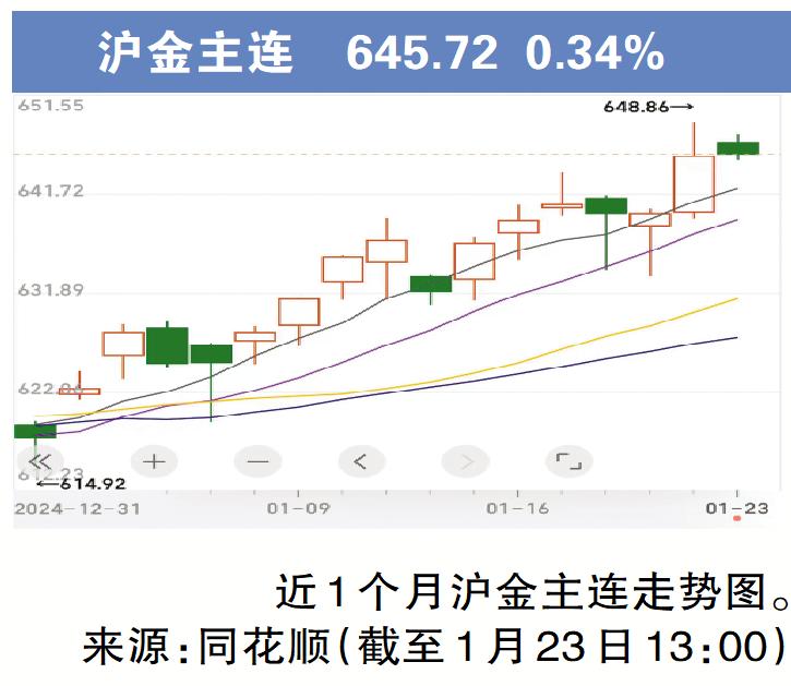 1月23日,上海期货交易所沪金主连涨至每克645.72元,盘中升破每克647元,继前一天刷新历史新高后保持高位。在终端消费市场,1月23日,周大福、六福珠宝等黄金珠宝品牌公布的境内足金首饰价格均突破830元/克,当中较高的已达836元/克,再攀历史高位。