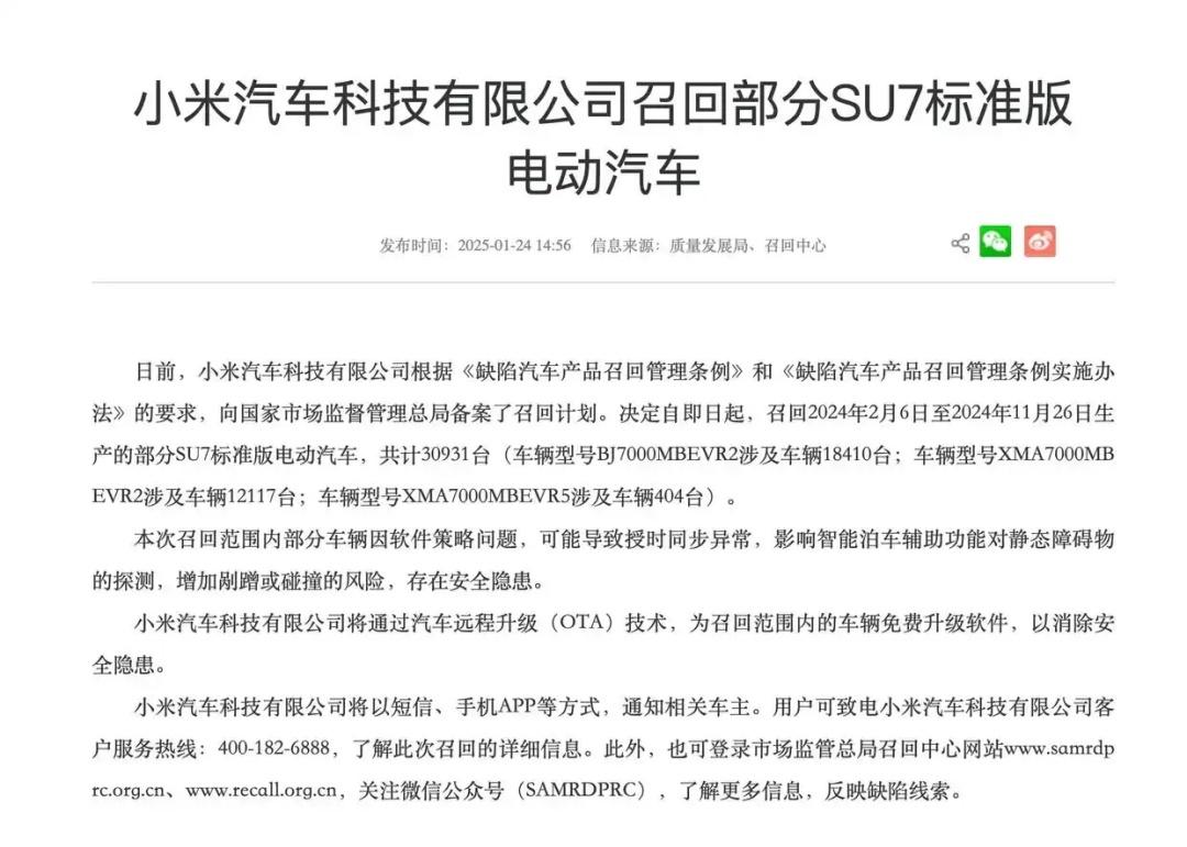 1月24日下午,小米汽车宣布召回约3.1万辆SU7。